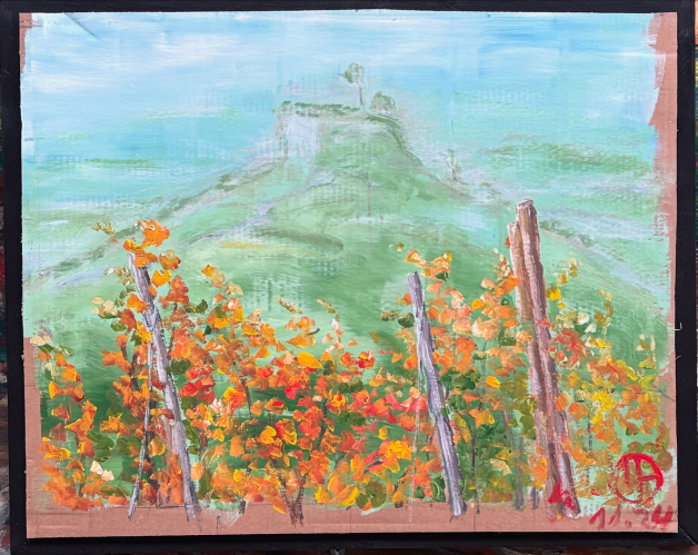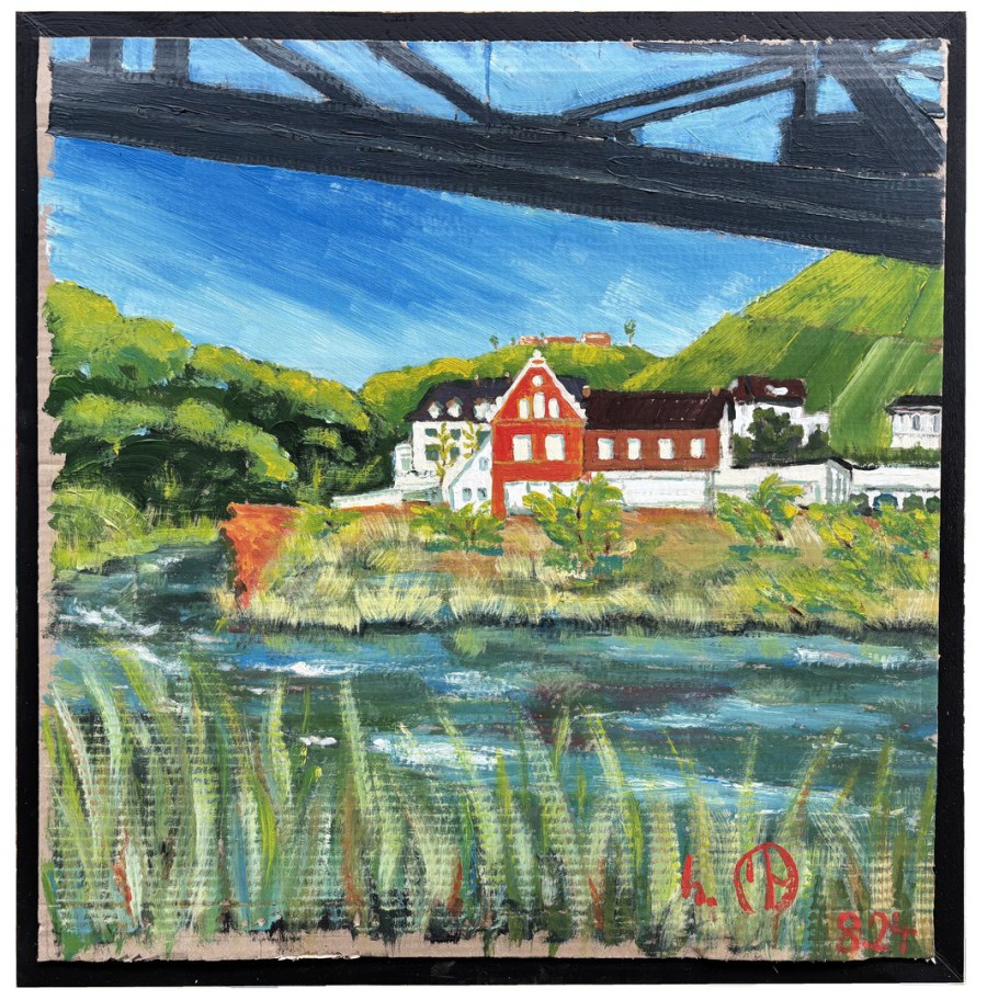 Dieses Gemälde ist eines aus einer Serie von zehn Gemälden zum Flutgedenken. Alle Gemälde sind ähnlich aufgebaut unten ein Fisch Logo über wellen und im Oberen teil jeweils ein Ort bzw. eine Landschaft des Ahrtals. In diesem Fall sehen wir das Ahrweiler Wehr bei Walporzheim im Morgennebel im Frühjahr 2025. Die Gemälde sind 70 cm hoch und 50 cm breit auf Karton gemalt. Verkaufspreis netto (Abholer) 240,-€; soll das Bild zusätzlich in einem Holz Wechselrahmen übergeben werden, kostet es 35,-€ zusätzlich.